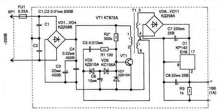 Данный источник может применяться для питания любой нагрузки мощностью до 15...20 Вт и имеет меньшие габариты, чем аналогичный, но с понижающим трансформатором, работающим на частоте 50 Гц.