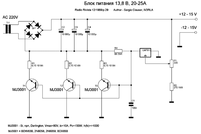Блок питания рассчитан на выходное напряжение 12-15 вольт при токе нагрузки 20-25А и более, зависит от трансформатора, конденсаторов фильтра, выпрямительных диодов, количества и параметров силовых транзисторов