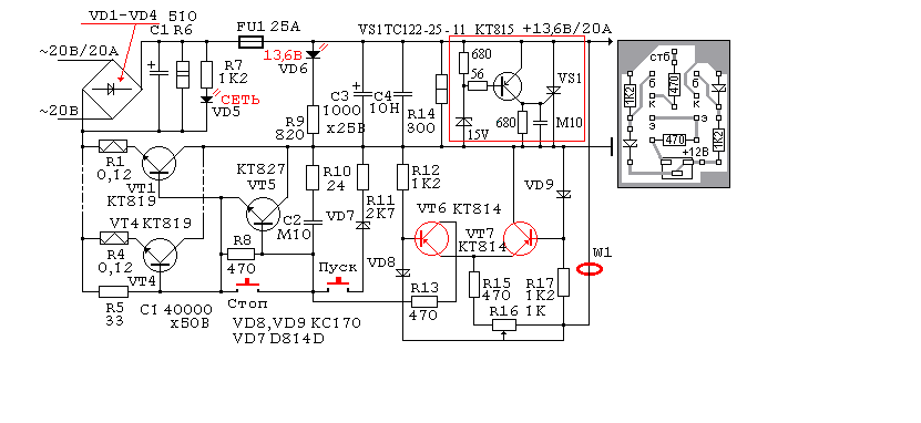На мой взгляд ее необходимо дополнить блоком ограничения выходного напряжения (в красной рамке). При выходе из строя транзисторов, диодов и т. д. - тиристор отрывается и "коротит" выход БП - предохранитель сгорает и …… трансивер цел.