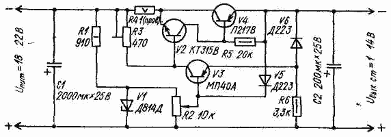 В одном из вариантов стабилизатора (рис VIII 22) выходное напряжение регулируют резистором R2 в пределах от 1 до 14 В при токе до 1 А.