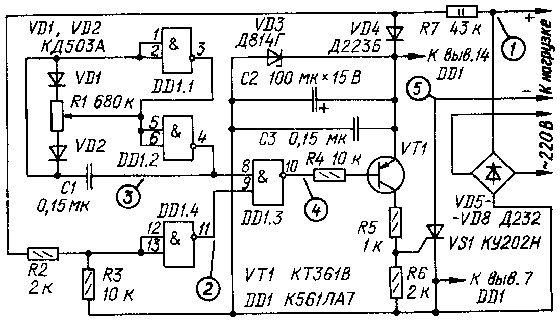 Принципиальная схема регулятора изображена на рис.1, а на рис.2 показаны временные диаграммы, иллюстрирующие принцип его работы (на диагр. 1-4 напряжения сняты относительно катода тринистора, а на диагр. 5 - между точками 1 и 5). Устройство состоит из мультивибратора с регулируемой скважностью импульсов (DD1.1, DD1.2), формирователя импульсов (DD1.4), узла совпадения (DD1.3). Мультивибратор формирует импульсы длительностью от 0 до Т при постоянном периоде следования Т (диагр. 3). В крайнем нижнем по схеме положении движка переменного резистора R1 на выходе элемента DD1.2 будет сигнал низкого уровня, что соответствует нулевой мощности в нагрузке, а в другом-сигнал 1, что соответствует 100 % мощности. В моменты, когда выпрямленное сетевое напряжение равно нулю (диагр. 1), формирователь вырабатывает короткие импульсы (диагр. 2). Узел совпадения пропускает на базу транзистора VT1 пачки импульсов (диагр. 4), которые управляют включением тринистора. Тринистор открывается и пропускает в нагрузку соответствующее число полупериодов выпрямленного напряжения (диагр. 5).