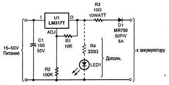 Схема собрана на регулируемом стабилизаторе напряжения LM317T. Его выходное напряжение Vout определяется по формуле Vout=1,25x(1+R2/R1). Сопротивление резистора R1 выбрано равным 10 кОм, а резистора R2 - 100 кОм, малый ток через эти резисторы (около 125 мкА) обусловливает небольшие потери. Выходное напряжение устройства составляет 13,75 В. Резистор R3 и диод защищают устройство от повреждения при коротком замыкании на выходе или при переполюсовке заряжаемой батареи, а также предупреждают разряд батареи в случае отключения стабилизатора от основного источника питания. Конденсатор С1 можно не устанавливать, но он обеспечивает устойчивость режима микросхемы при экстремальном зарядном цикле. С соответствующим теплоотводом устройство выдает ток до 1,5 А. Оно может быть постоянно подключено к аккумуляторной батарее, и перезаряда не случится.