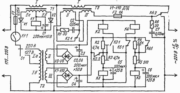 Экономичный стабилизатор переменного напряжения предназначен для питания от сети электронной бытовой ппаратуры, потребляемая мощность которой не превышает 500 Вт при сетевом напряжении 220 В и 270 Вт при 127 В. Стабилизатор не только автоматически поддерживает выходное напряжение в пределах установленных допусков (+5... -10 %) от номинального при изменении напряжения сети от 175 до 255 В, но и