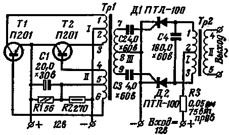Резистор R3 предохраняет источник питания от короткого замыкания в моменты переключения ключей. Частота выходного напряжения устройства при указанных данных равна 200 гц. Если предусмотреть возможность изменения частоты автогенератора (например, вместо автогенератора собрать регулируемый по частоте мультивибратор с усилителем мощности), то на выходе преобразователя можно получить напряжение с частотой 50-400 гц, что позволит использовать его для плавного регулирования скорости вращения синхронных электродвигателей мощностью до 500 вт. Изменяя соответствующим образом число витков вторичной обмотки трансформатора Тр2, можно получить на выходе преобразователя напряжения различной величины.