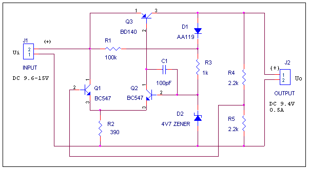 Отличительной особенностью данного регулятора является его способность регулировать напрядение, когда величина входного и выходного напряжения почти равны. ( Большинство трёх ножечных регуляторов напряжения требуют разницы между входным и выходным напряжением около 3-х вольт для нормальной работы).Чтобы обслуживать ситуации, где два напряжения почти равны, необходимо использовать дискретные компоненты. Транзистор BD140 надо установить на радиатор, мощность рассеиваемая на транзисторе порядка 5-6 Ватт. Уровень выходного напряжения определяется по формуле Uo={(R4+R5)/R5}*Uzener.