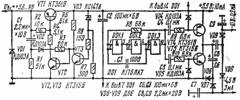Импульсный преобразователь содержит генератор, выходной транзисторный каскад и емкостный умножитель напряжения. Исходя из соображений экономичности генератор собран на микросхеме DD1 типа КМОП. Выходное