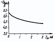 апряжение генератора представляет собой импульсный меандр с частотой около 10 кГц. Оно подается на базы транзисторов VT4 и VT5 выходного каскада и поочередно переводит их в открытое состояние. Когда открыт транзистор VТ4, происходит зарядка конденсатора С6 через этот транзистор и диод VD6. В следующий полупериод импульсного напряжения генератора открывается транзистор VT5 и конденсатор С6, разряжаясь через него и диод VD7, передает энергию на конденсатор С7. В результате конденсатор С7 заряжается примерно до выходного напряжения стабилизатора. При открытом VT4 происходит зарядка конденсатора С8 по цепи: +Uстаб, VT4, С8, VD8, С7, общая шина. В этой цепи имеются два последовательно включенных источника напряжений: Uстаб и Следовательно, конденсатор С8 будет заряжаться примерно до напряжения Uc8 = Uстаб + Uc7 = 10В. Это напряжение при открывании транзистора VT5 через диод VD9 передается на выходной конденсатор С9. При каждом цикле перезарядки конденсаторов умножителя напряжения происходит потеря напряжения на диодах и на открытых транзисторах VT4 и VT5, поэтому выходное напряжение с увеличением тока нагрузки уменьшается. Эта зависимость для отрицательного напряжения —4,5 В представлена на рис. 2.