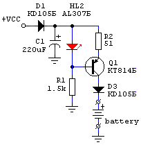 Входное напряжение должно быть больше суммы заряжаемых аккумуляторов на 2V, т.е, если Вы заряжаете два аккумулятора, каждый естественно является носителем 1.5V, подаваемое входное напряжение должно быть 5V. Устройство не критично к подбору компонентов, главное, чтобы диоды были способны выдержать зарядный ток. Резисторы на схеме ваттностью 0,25 W, транзистор КТ814 можно заменить на КТ816. В процессе зарядки светодиод HL2 горит, по окончании - гаснет.