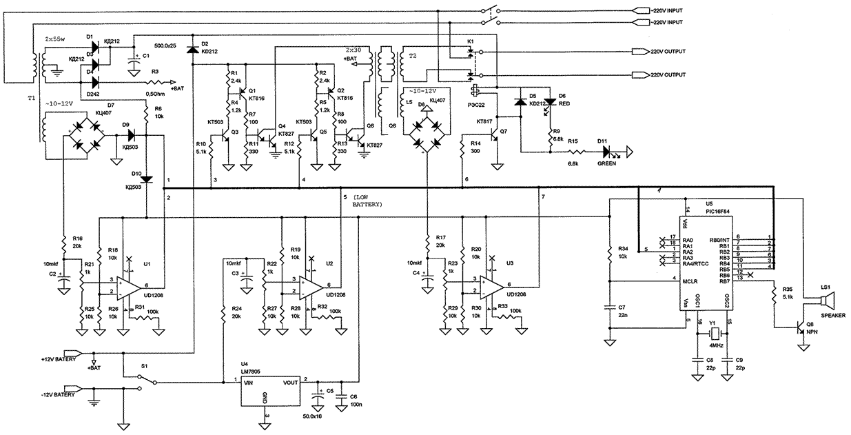 За основу устройства взята схема из журнала "Моделист-конструктор". ИБП обеспечивает: • в прямом режиме преобразование постоянного напряжения 12В в переменное 220В/50 Гц при максимальном потребляемом токе не более 6А. Выходная мощность - до 220Вт (1А); • обратный режим (режим заряда аккумулятора). При этом ток заряда - до 6А; • быстрое переключение из прямого в обратный режим. Схема ИБП приведена на рисунке. На элементах VT3, VT4, R3...R6, С5, С6 выполнен тактовый генератор, вырабатывающий импульсы с частотой около 50 Гц. Он, в свою очередь, управляет работой транзисторов VT1, VT6, в коллекторные цепи которых включены обмотки IIa, IIб трансформатора Т1. Диоды VD2, VD3 - элементы защиты транзисторов VT1, VT6 в прямом режиме и выпрямители в обратном режиме. Элементы С1, С2, L1 образуют сетевой фильтр, VD1, С3, С4 - фильтр тактового генератора. Рассмотрим, как работает схема в обоих режимах. Прямой режим (=12В / ~220В). Напряжение +12В попеременно прикладывается к обмоткам IIа или IIб, а трансформатор Т1 преобразует его в напряжение 220В/50Гц. Это напряжение присутствует на розетке XS1, и к ней подключаются всевозможные потребители (лампы накаливания, телевизор и др.) Индикатором нормальной работы является свечение светодиодов VD4, VD5. Ток нагрузки может достигать 1 А (220Вт). Обратный режим (~220В / =12В). Для работы в обратном режиме необходимо сетевой шкур подключить к разъему ХР1 и подать на него ~220 В. После этого переключается тумблер SB1. При этом сетевое напряжение попадает на первичную обмотку трансформатора Т1, а тактовый генератор отключается. Благодаря этому на вторичных обмотках Т1 получаются два переменных напряжения 10В, которые выпрямляются диодами VD2, VD3. Индикатором нормальной работы в обратном режиме является свечение светодиода VD5. Кипение в банках аккумулятора GB1 свидетельствует о процессе его зарядки. Детали и конструкция: Т1 - любой трансформатор, обеспечивающий два напряжения 10В при Токе до 10А. Лучше всего использовать сердечники типа ШЛ и ПЛ, которые легче разбираются. Катушка L1 выполнена на ферритовом кольце К28х16х9 М2000НМ и содержит две обмотки по 10 витков провода диаметром 0,5...0,71 мм. Транзисторы VT1, VT6 и диоды VD2, VD3 крепятся через слюдяные прокладки, смазанные теплопроводящей пастой, на один общий радиатор площадью не менее 200 кв.см.