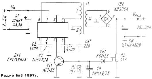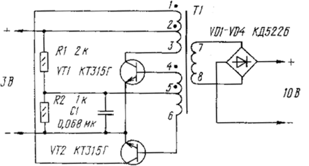 Преобразователь работает на частоте 100 кГц и обеспечивает выходное напряжение 10В при токе нагрузки до 15 мА. Трансформатор Т1 выполнен на кольце К7х4х2 из феррита марки 600НН. Обмотки 1-2 и 2-3 содержат по 5 витков; обмотки 4-5 и 5-6 - по 15 витков; обмотка 7-8 - 51 виток.
