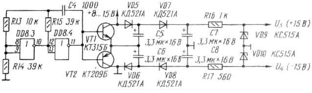 На элементах DD1.1, DD1.2 собран задающий генератор с частотой 500 Гц. Делитель на DD2 формирует две импульсные последовательности частотой 50 Гц со сдвинутыми на 180° фазами для управления силовыми ключами VT1 и VT2 двухтактного преобразователя. Чтобы избежать сквозных токов переключения, между выключением одного ключа и включением другого существует "мертвая зона" — 10% длительности периода. При подаче высокого уровня (логической "1") на вход "Блокировка" оба выходных ключа запираются. Выходная мощность преобразователя ограничена мощностью силового трансформатора Т1 и максимальным допустимым током выходных транзисторов. Коэффициент трансформации силового трансформатора Кт=20. В качестве выходных транзисторов подойдут IRFZ034 (15 A), IRFZ044 и RG723A (30 А), IRFZ046 (50 A), IRFP064 (100 А). Для надежности нужно иметь двойной запас по току и тройной — по напряжению. Силовые цепи должны быть по возможности короче и выполнены проводами соответствующего сечения. Схема преобразователя потребляет в дежурном режиме ток порядка 7 мА. Счетчик-распределитель К561ИЕ8 (рис.1) имеет вход сброса (вывод 13), высокий уровень на котором приводит микросхему в исходное состояние. При этом прекращается счет, и все выходы, кроме нулевого (вывод 3), сбрасываются в ноль. Оба выходных транзистора VT1 и VT2 при этом закрыты, т.е. преобразователь заблокирован. Предлагаемую схему преобразователя желательно дополнить схемами защиты и сервиса, включающими: • защиту от остановки задающего генератора, она же блокировка (рис.2а); • защиту выходных транзисторов от превышения напряжения на аккумуляторе свыше 15 В (рис.2б); • защиту аккумулятора от глубокого разряда (рис.2в). Эта же схема служит индикатором напряжения аккумулятора; при 10В светодиод VD9 гаснет, при 15В светит в полную силу; • защиту от неверного подключения, т.е. переполюсовки аккумулятора (рис.2г); • автомат перехода на резервное питание при пропадании напряжения в сети, и возвращения на питание от сети при появлении сетевого напряжения (рис.2д). Схема аварийной блокировки показана на рис.2а. Конденсатор С4 заряжается через R13 до напряжения питания при отсутствии импульсов с выхода DD1.2 и подает логическую "1" на вход блокировки (вывод 13 DD2) через VD13. При нормальной работе преобразователя, на выходе "Сброс блокировки" (вывод 1 DD2) каждые 20 мс появляется логическая "1", которая через R11 открывает транзистор VT5 и разряжает С4, не давая тем самым сработать блокировке. Защита от превышения напряжения на аккумуляторе (рис.2б). При превышении Ua>15 В открывается стабилитрон VD10, током через R9 открывается VT4 и подает логическую "1" через VD12 на вход блокировки. Эта блокировка нужна для предотвращения выхода из строя силовых транзисторов. Для защиты всей схемы параллельно С5 нужно включить стабилитрон КС515. Такой ситуации не возникнет, если зарядное устройство не окажется подключенным к преобразователю без аккумулятора, Лучше преобразователь и зарядное устройство подключать к АБ разными проводами, Защита АБ от глубокого разряда (рис,2в). Величина R7 подбирается таким образом, чтобы при Ua<10,5 В Транзистор VT3 уже закрылся, светодиод VD9 погас, и через R8 и VD11 подалась логическая "1" на вход блокировки. С2 предотвращает блокировку в случае кратковременного понижения Uа. Защита от неверного включения (перепопюсовки) АБ (рис.2г). При аварийной блокировке на выводе 9 DD1.4 присутствует лог