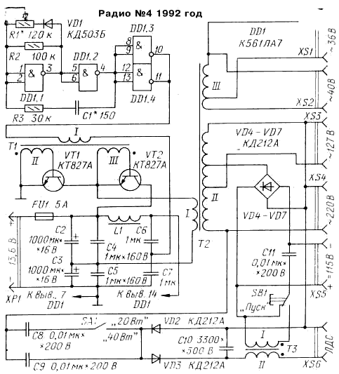 Для автотуриста, особенно на длительном привале, единственным источником электроэнергии служит аккумуляторная батарея автомобиля. Поэтому, естественно, и все походные осветительные и нагревательные приборы питаются от нее. А если в дорогу взяты приборы, рассчитанные на напряжения 36, 127, 220 В? Ничего страшного. Выручит преобразователь напряжения, схема которого показана на рисунке. Описываемое устройство позволяет питать люминесцентную лампу, электропаяльник на напряжение 36 В, электробритву и другие приборы. Максимальная мощность нагрузки преобразователя - 40 Вт, при этом ток, потребляемый от аккумуляторной батареи, составляет примерно 4 А. Вилкой ХР1 преобразователь подключают к прикуривателю или розетке, соединенной с аккумуляторной батареей автомобиля. С целью уменьшения габаритов конструкции преобразователя частота задающего генератора, собранного на элементах DD1.1 и DD1.2, выбрана около 25 кГц. Элементы DD1.3 и DD1.4 образуют буферный каскад, нагрузкой которого служит обмотка I согласующего трансформатора Т1. Импульсы напряжения на обмотках II и III трансформатора управляют мощными ключевыми транзисторами VT1, VT2. При этом ток в первичной обмотке трансформатора Т2 преобразователя достигает в импульсе 8 А, что обеспечивает требуемую мощность на его вторичных обмотках. Напряжение питания на элементы задающего генератора и буферного каскада поступает через развязывающий фильтр L1C4C6. Чтобы генератор вырабатывал сигнал симметричной формы - меандр, необходимый для управления транзисторными ключами, в него введена цепочка R1VD1, выравнивающая длительность зарядки и разрядки конденсатора С1. Обмотка III трансформатора Т2 рассчитана на подключение к ней (через разъемы XS1, XS2) приборов на напряжение 36...40 В. Отводом обмотки можно изменять мощность, потребляемую нагрузкой, например, подбирать температуру нагрева жала электропаяльника. Обмотка II этого трансформатора предназначена для питания приборов, рассчитанных на переменные напряжения 127 и 220 В. Часть напряжения, снимаемого с верхней по схеме секции обмотки, выпрямляется диодами VD4-VD7, включенными по схеме моста, а пульсации выпрямленного напряжения сглаживает конденсатор С 11. В результате на разъеме XS5 (при замкнутых контактах кнопки SB1) действует постоянное напряжение 115 В - для питания электробритвы с коллекторным электродвигателем. Впрочем, это напряжение может иметь другое значение- в зависимости от конкретной модели электробритвы. Известно, что для включения люминесцентных ламп без подогрева нитей накаливания необходимо напряжение более 500...600 В. Чтобы получить его, напряжение 200 В обмотки II трансформатора Т2 подается на выпрямитель-умножитель, выполненный на диодах VD2, VD3 и конденсаторе С9. В результате на конденсаторе С10 действует повышенное напряжение постоянного тока. Для люминесцентной лампы мощностью 40 Вт параллельно конденсатору С9 подключают (тумблером SA1) конденсатор С8. Однако напряжения на фильтрующем конденсаторе С10 оказывается недостаточным для зажигания люминесцентной лампы. Поэтому в этот узел устройства введен дополнительный пусковой трансформатор ТЗ, но включают лампу вручную кнопкой SB1. Вот как это происходит. При замкнутых контактах кнопки SB1 конденсатор С11 заряжен до напряжения 115 В. При нажатии на кнопку он быстро разряжается через первичную обмотку трансф