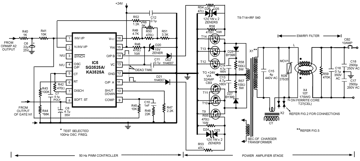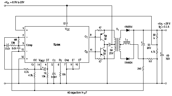 Схема, приведенная на рисунке - блок питания от автомобильного усилителя Jensen (4x40 Вт). Схема упрощена - не показаны каскады защиты от перегрузок усилителей по току и термозащиты. Группы электролитических конденсаторов показаны как один конденсатор суммарной емкости. Трансформатор преобразователя намотан на ферритовом кольце К42х28х10. Первичная обмотка намотана "косой" из восьми проводов диаметром 1,2 мм и содержит 6,5 витков; вторичная - "косой" из четырех проводов диаметром 1 мм. После намотки каждая коса разделена на две части и начало одной половины обмотки соединяется с концом другой. Дроссель намотан на ферритовом стержне диаметром ~16 мм. и содержит ~10 витков провода диаметром 2мм. Его данные не критичны.