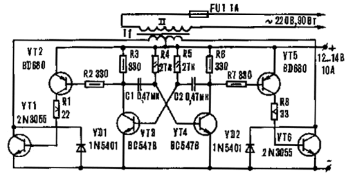 С помощью данного устройства можно получить переменное напряжение 220В от 12-вольтовой аккумуляторной батареи. Его схема опубликована в болгарском журнале "Млад конструктор". Основой его служит мультивибратор на транзисторах VT3, VT4, работающий на частоте 50 Гц. На транзисторах VT1, VT2 и VT5, VT6 собраны мощные усилители, нагруженные на согласующий трансформатор Т1 мощностью 100 Вт. Его вторичная обмотка рассчитана на напряжение 220 В и ток 0,5 А, две первичные обмотки - каждая на 10В и 10А. Преобразователь может питать электролампы, паяльники, кофеварки и другие электроприборы, для которых прямоугольная форма напряжения не имеет значения. Устройство может служить в качестве аварийного источника сетевого напряжения. Указанные на схеме полупроводниковые приборы можно заменить отечественными: VD1, VD2 - КД213, Д232; VT1, VT6 - КТ805, КТ819М, VT2, VT5 - КТ814, КТ816, VT3, VT4 - КТ315, КТ312 с любыми буквенными индексами.