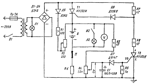 стройство питается от сети переменного тока напряжением 127— 220 В и работает следующим образом. Во время заряда батареи Б тиристор Т1 открыт. При этом напряжение U на потенциометре R4 ниже порогового напряжения (12—14 В) стабилитрона Д7, и тиристор Т2 закрыт.