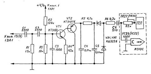 С помощью резистора R4 введена глубокая ООС по постоянному току, линеаризирующая регулировочную характеристику канала управления на транзисторах VT1, VT2. Конденсатор СЗ способствует уменьшению проникания ВЧ - подмагничивания.