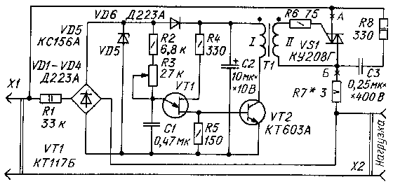 Выпрямительный мост VD1-VD4 и стабилитрон VD5 обеспечивают питание узла управления симистором VS1 пульсирующим напряжением. Резистор R1 гасит избыточное напряжение сети. Задержку открывания симистора по фазе определяет время зарядки конденсатора С1 через резисторы R2 и R3 от источника напряжения, уровень которого определяется стабилитроном VD5 и коэффициентом передачи однопереходного транзистора VT1.