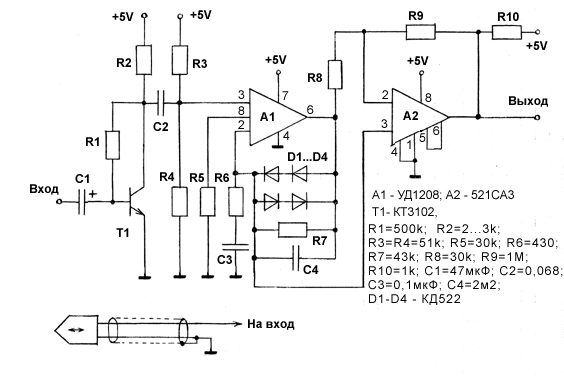 Принципиальная схема приведена на рисунке 2. За основу взята схема "читалки" от Spectrum-совместимого компьютера "Ленинград". Добавлен только входной каскад на одном транзисторе. При исправных деталях схема не требует наладки, собрана у автора на макетной плате. Обратите особое внимание на тщательное экранирование узлов и соединений. Схемка с ключевым транзистором для оптодатчика не показана в силу своей примитивности.