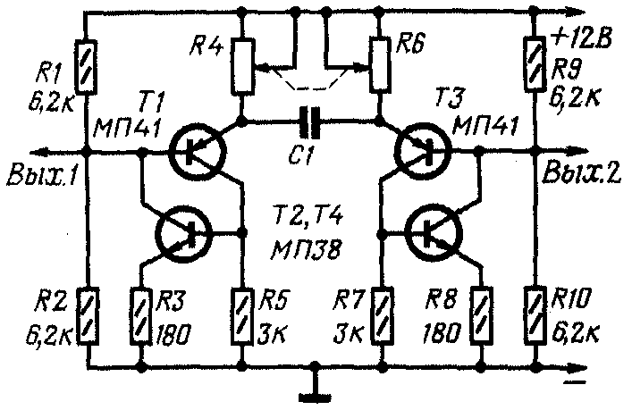 На рисунке приведена схема одного из таких генераторов. Он позволяет получать как симметричные, так и несимметричные прямоугольные импульсы с периодом следования от десятков микросекунд до 30 с. При этом емкость конденсатора C1 должна изменяться от 300 пФ до 50 мкф, а сопротивление резисторов R4 и R6 — от 10 кОм до 1,5 МОм. Амплитуда выходного сигнала в два раза меньше напряжения питания. Уменьшение напряжения питания до 8 В не влияет на период колебаний.