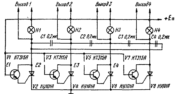 На схеме показаны четыре одинаковые сенсорные ячейки, каждая из которых содержит тринистор, транзистор, коммутирующий конденсатор и индикатор. При касании пальцем любой из четырех пар контактов Е1...Е4 в цепи базы соответствующего транзистора (VI, V3, V5 или V7) потечет ток, открывающий транзистор, который в свою очередь откроет соответствующий тринистор. Конденсаторы С1...С4 служат для выключения ранее работающей ячейки при касании сенсора другой ячейки, так как в этом случае напряжение этих конденсаторов оказывается приложенным к работавшему тринистору с обратной полярностью, что приводит к его выключению. Для индикации состояния ячеек служат лампы Н1...Н4.
