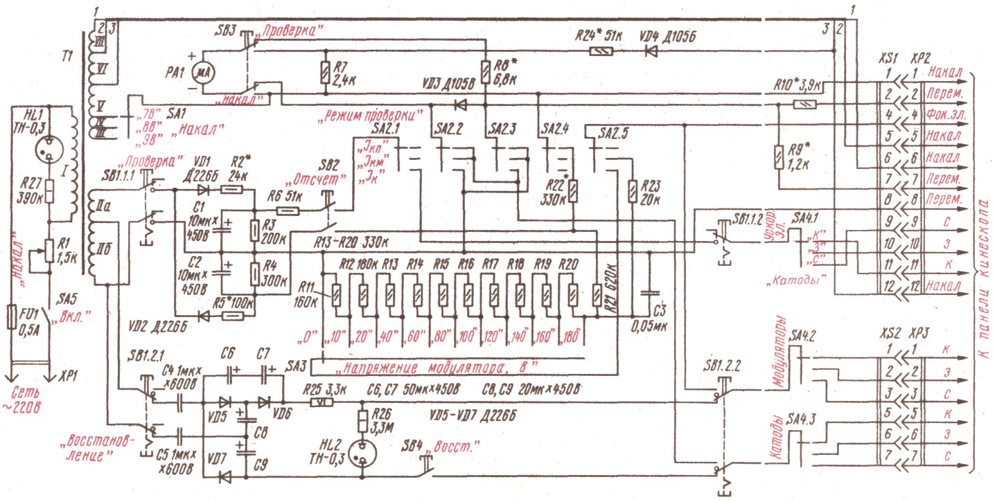 Практическое изготовление комбинированного прибора для проверки кинескопов и восстановления эмиссии их истощенных катодов по описаниям в [1 и 2] выявило ряд недостатков рассмотренных ранее устройств. Так, при проверке на утечку (замыкание) между катодом и подогревателем или катодом и модулятором - невозможно определить, с каким из катодов («красным», «зеленым» или «синим») произошло замыкание; нельзя проверить щелевые кинескопы 51ЛК2Ц и не предусмотрена возможность их восстановления, так как для их проверки цепи «красного», «зеленого» и «синего» катодов должны быть разделены, а в приборе [1] они замкнуты между собой. Кроме того, при усовершенствовании прибора [2] завышена мощность трансформатора, в результате чего он имеет большие массу и габариты, а также требуется ненужный расход провода из-за наличия двух вторичных обмоток, которые одновременно под нагрузкой не бывают. К тому же прибор содержит излишнее число разъемов для подключения кинескопов к прибору, что очень неудобно при эксплуатации.