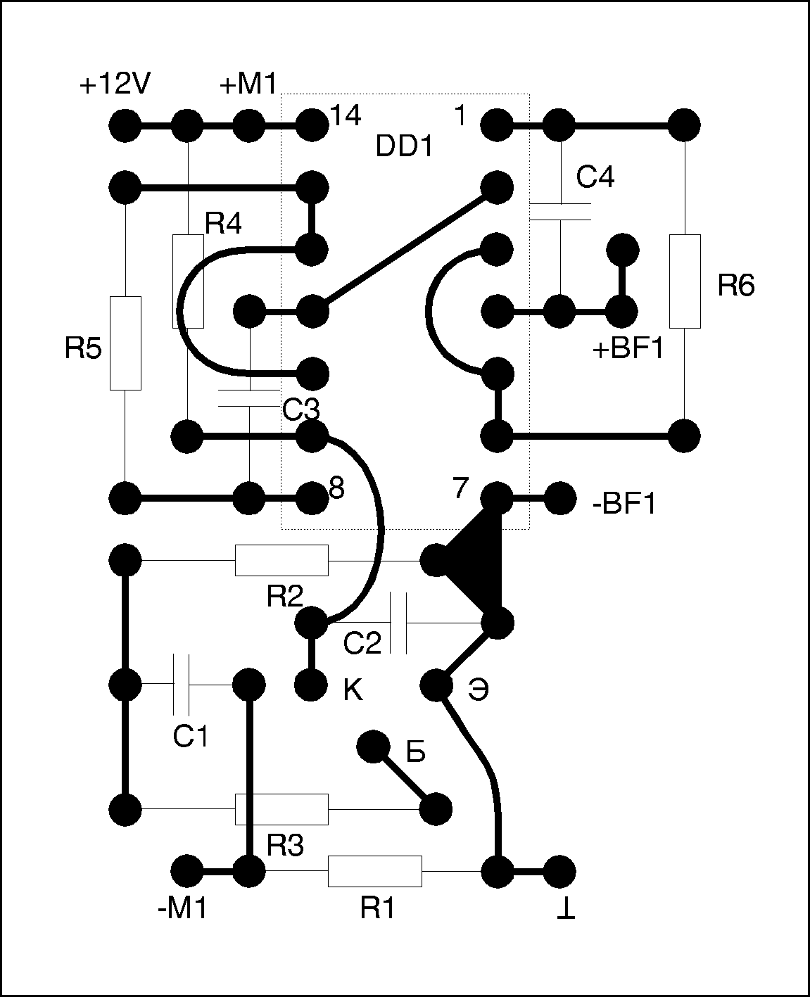 Высокий уровень на входе 9 DD1 разрешает работу генератора, собранного на вентилях DD1.1-DD1.4 и формирующего прерывистый звуковой сигнал. Частота звука зависит от C4 и R6 (приведенные на схеме номиналы соответствуют приблизительно 2 кГц), частота прерывания звука - с помощью C3 и R5 (по схеме 9-10 Гц).