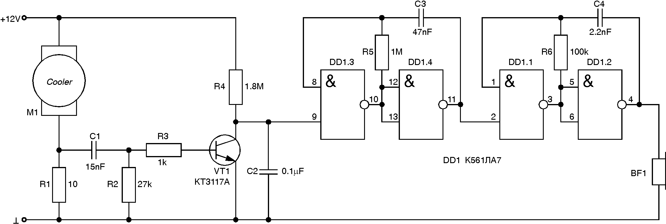 Устройство предназначено для подачи звукового сигнала при остановке вентилятора, охлаждающего центральный процессор ПК (т.е. кулера). Сигнализатор включается в разрыв кабеля питания кулера, размеры печатной платы 40x32.5 мм (умещается в спичечном коробке). Принципиальная схема сигнализатора изображена на рисунке 1.