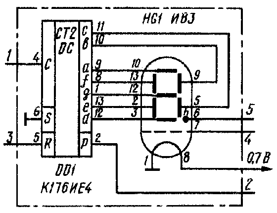 Вместо указанных на схеме в устройстве могут быть применены как знаковые светодиодные индикаторы других типов, так и катодолюминесцентные. Схема подключения катодолюминесцентного индикатора ИВ3 показана на рис.2. В этом случае резистор R12 основной схемы подключают не к общему проводу, а к эмиттеру транзистора VT2. Кроме того, для питания индикаторов ИВ3 потребуется дополнительный источник напряжения 0,7 В.
