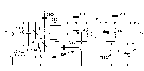 Схема, показанная на рисунке, работает на расстояние до 5км. Чтобы превратить ее в схему на 1км, следует исключить оконечный каскад на КТ610 и подсоединить антенну к средней точке катушки L3.