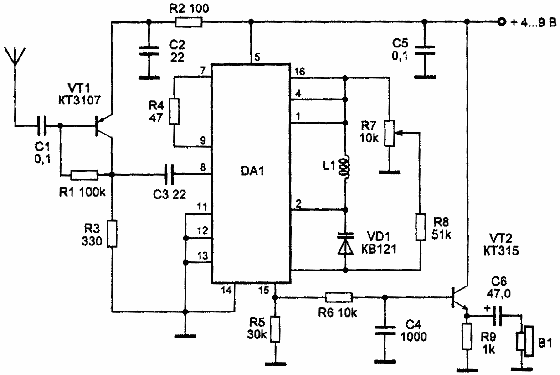 Выходное напряжение НЧ с выхода микросборки поступает на вход эмиттерного повторителя на транзисторе VT2 типа КТ315. С него сигнал подается на головные телефоны В2 или на вход УЗЧ с чувствительностью не хуже 50 мВ.