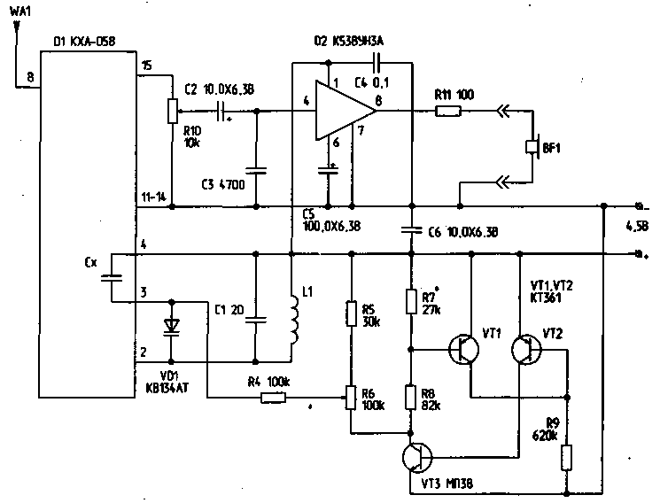 Два года назад у нас в продаже появилась микросхема КХА-058. На ее базе я сделал УКВ радиоприемник, схему которого представляю вашему вниманию. Приемник был задуман для работы на наушники от плейера. Он минимальных размеров и удобен для переноски в нагрудном кармане куртки, рубашки. Так как микросхема потребляет сравнительно большой ток (8...14 мА), в качестве источника питания я применил три цилиндрические батарейки размером 14 х 50 мм. Остальная часть схемы была выбрана с учетом пониженного напряжения питания и малого потребления тока. В качестве УНЧ использовалась микросхема К538УН3А [1]. Она обеспечивает достаточную мощность на нагрузке. Для согласования микросхемы с низкоомной нагрузкой необходимо включить последовательно с ней резистор 100 Ом. Для работы на громкоговоритель можно применить микросхему К157УД1 [2]. Обе микросхемы сохраняют работоспособность при снижении напряжения питания до 3 В. Для перестройки приемника по диапазону используется варикап КВ134АТ (можно использовать КВ132АТ), который включается в контур гетеродина через разделительный конденсатор. В качестве такого конденсатора я использовал свободный конденсатор микросхемы между ее третьей и четвертой ножками.