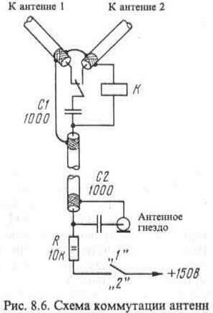 нон коробкой включить антенный усилитель. Следует напомнить, что в том случае, когда уровень сигнала недостаточен даже для работы одного телевизора, нужно использовать более эффективную антенну, а при длинном фидере антенный усилитель должен быть установлен на мачте поблизости от антенны. Другой вариант разветвительной коробки, аналогичной тем, которые используются в сетях антенн коллективного пользования, показан на рис. 8. 2. Эту коробку можно использовать для подключения двух телевизоров к индивидуальной наружной антенне. Коробка этого типа обеспечивает согласование фидера с нагрузкой независимо от того, подключены ли к обоим выходам телевизоры, а также незначительно ослабляет сигнал на выходах относительно уровня сигнала на входе коробки. Коробка содержит две одинаковые катушки из медной голой посеребренной проволоки диаметром 1 мм. Катушки наматываются на оправке диаметром 4 мм и содержат по 3 витка. После намотки катушки снимаются с оправки и растягиваются в спираль с шагом 2 мм (расстояние между витками равно диаметру провода).