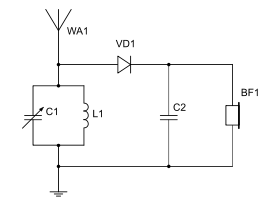 ![]() Это самый простейший и самый парвый радиоприёмник. Он состоит из антенны и заземления подключённых к колебательному контуру из катушки L1 и перестраиваемого конденсатора C1, диодного детектора на диоде VD1, фильтра нижних частот, образованного C2 и сопротивлением наушников BF1, и самих наушников. Особенность этого радиоприёмника в том, что он не тебует внешнего питания. |