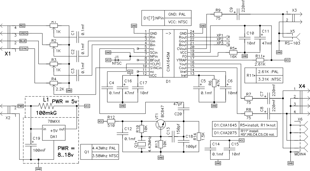 В случае использования CXA2075 не припаивать резистор R5*, R6, C4, C5, C6.