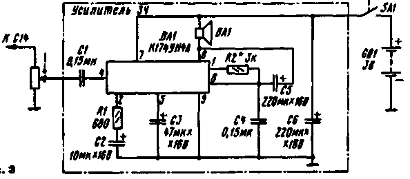 Следующим вариантом может быть усилитель 3Ч, выполненный на микросхеме К174УН17, рассчитанной на работу с высокоомными (не менее 30 Ом) стереофоническими головными телефонами. В данном случав вместо телефонов будет работать, например, динамическая головка 0.5ГДШ-1 со звуковой катушкой сопротивлением 50 Ом. При напряжении 2...3 В такой усилитель сможет развивать выходную мощность около 20 мВт, что обеспечит достаточно громкое звучание.
