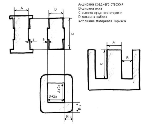 Чтобы все обмотки разместились в окне сердечника необходимо соблюдать условие, чтобы толшина набора пластин сердечника не превышала ширину среднего стержня более чем в два раза.