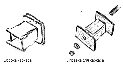 Как собрать каркас понятно из рисунка. Если детали изготовлены аккуратно, то ни какого крепления деталей (склейка) не требуется. Не лишнее, а в случаях когда каркас изготовлен из тонкого материала даже необходимо, перед намоткой изготовить оправку для каркаса, которая позволит не допустить деформацию каркаса при намотке на него обмоточного провода.